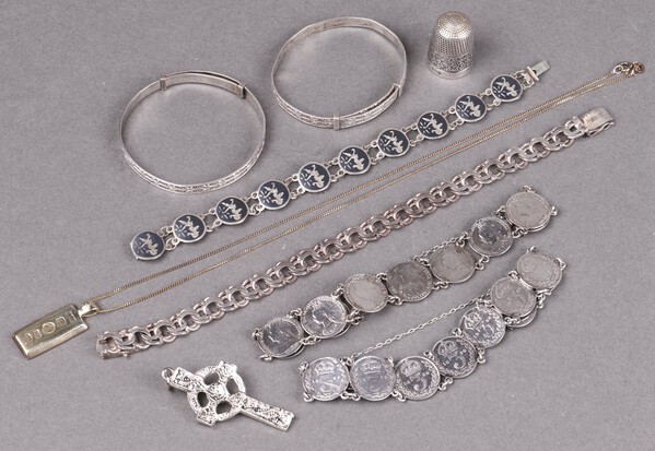 Lot 175 A 925 silver ingot pendant, a niello bracelet, 2 bracelets formed from coins, silver thimble, 2 child's engraved bracelets etc £60-80