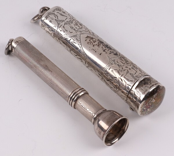 Lot 176 An Edwardian engraved silver cheroot case Birmingham 1908 by A Bromet & Co. together with a silver cigar drill Birmingham 1955, 33 grams £50-70