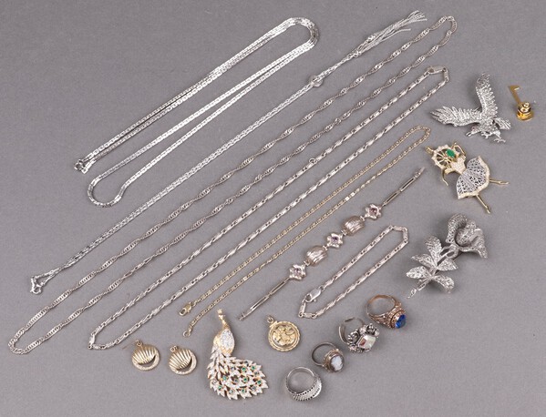 Lot 178 A marcasite brooch in the form of an eagle, a ditto rose shaped brooch, a Tiffany and Co. gold plated key pin marked Canberra a pair of circular metal paste set earrings and other items of costume jewellery £50-75