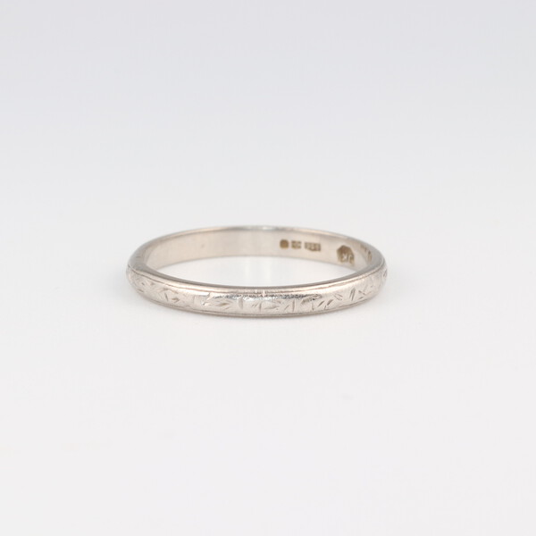 An engraved platinum wedding band marked Plat., size K, 2.3 grams