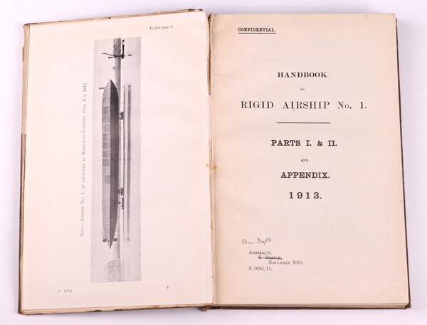 MASTERSON Commander E. A. R.N. Handbook on Rigid Airship No. 1 Parts I & II and Appendix 1913. Admiralty S Branch S.0281/13. 8vo., bound in blue tooled cloth, gilt title to spine, gilt "No.43" to top right front board. Fading to spine and cover, rubbing to corners and edges of spine, (spine detatched from front edge), Errata list 1914 glued to front page, "S Branch" on title page crossed out and replaced "Air Dept." Photos, diagrams and fold out coloured plates throughout. Signed to pastedown B N Wallis and marked Shore Station Barrow in Furness