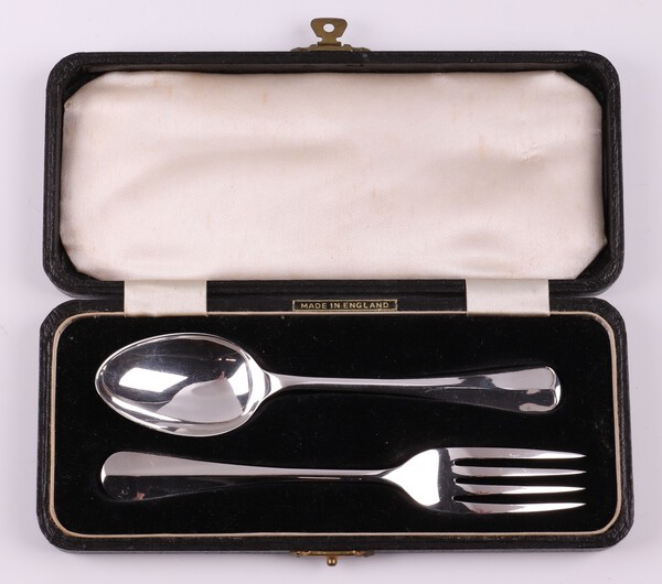 Lot 184 A silver 2 piece rat tail pattern christening set comprising spoon and fork, cased, Birmingham 1962 by Fenton Brothers, 52 grams £40-50