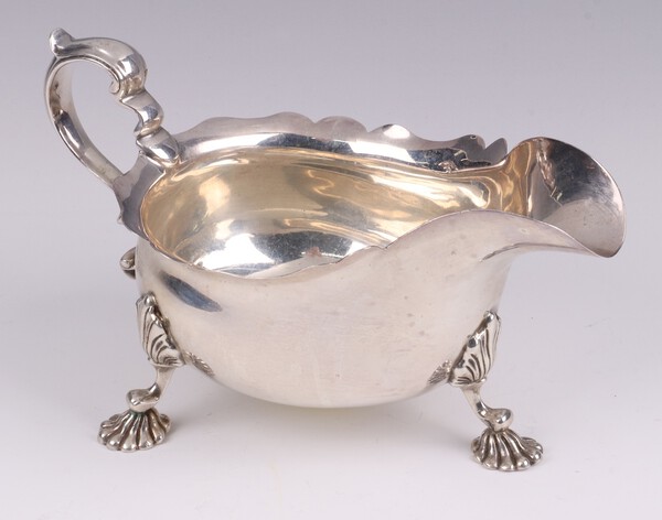 Lot 185 A Georgian style silver sauce boat with wavy border, C scroll handle and hoof supports, Birmingham 1929 by Adie Brothers Ltd., 304 grams £260-320