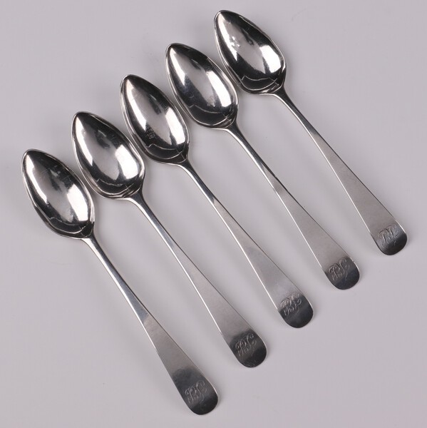 Lot 192 Five Georgian silver Old English pattern teaspoons, monogrammed, hallmarked Newcastle, by Thomas Watson (1794-1798), 55 grams £40-60