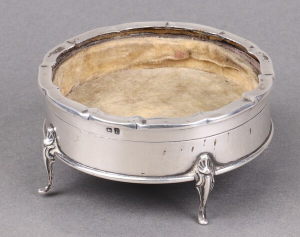 Lot 193 A circular silver trinket box with hinged lid on panelled supports, Birmingham 1916, 5cm x 10cm (lid missing) £50-75
