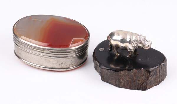 Lot 194 An oval agate mounted pill box 5cm together with a model of a walking rhinoceros raised on a polished wooden base 4cm £50-75