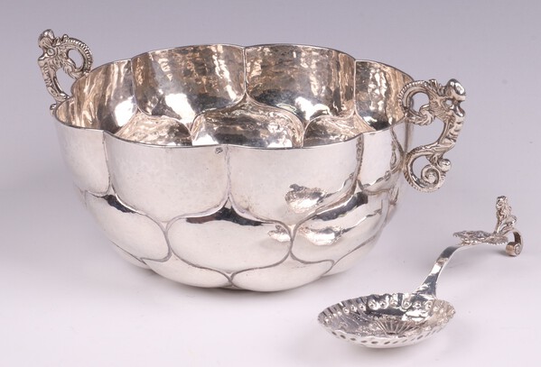A Continental embossed silver spoon 12cm and a white metal twin handled bowl 14cm