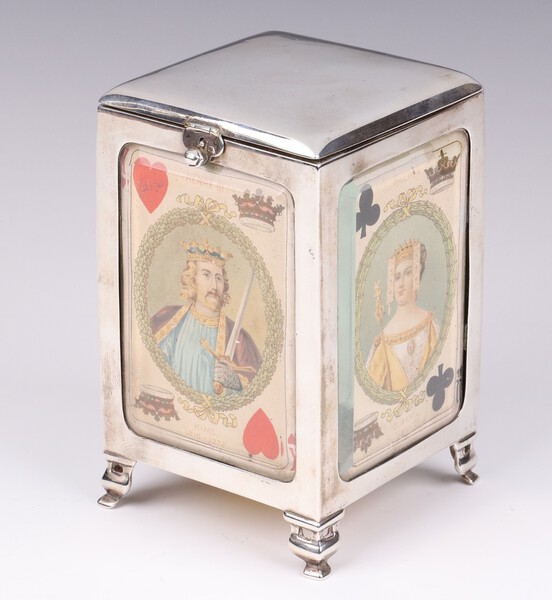 Lot 194 Levi & Salaman, an Edwardian silver playing card holder decorated playing cards, the interior with sprung movement containing 2 packs of cards, Birmingham 1903 (marks rubbed) 12cm h x 8cm w x 8cm d £800-1200