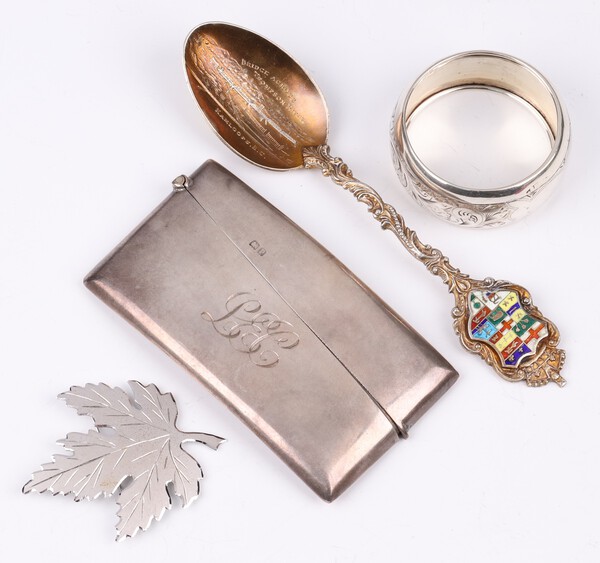 Lot 195 A silver card case, monogrammed, Birmingham 1914 by William Henry Sparrow, an engraved silver napkin ring Birmingham 1909, a Sterling brooch in the shape of a maple leaf together with an enamelled souvenir spoon, 83 grams £50-75