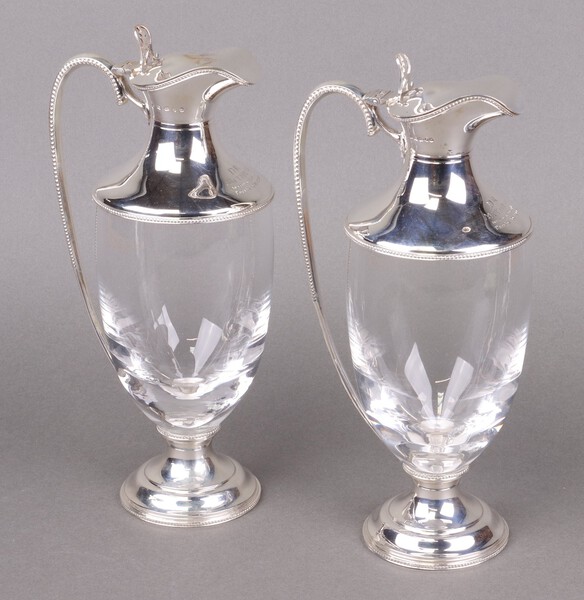 Lot 196 A pair of glass and silver mounted claret ewers, London 2007, both inscribed, 25cm h £150-200