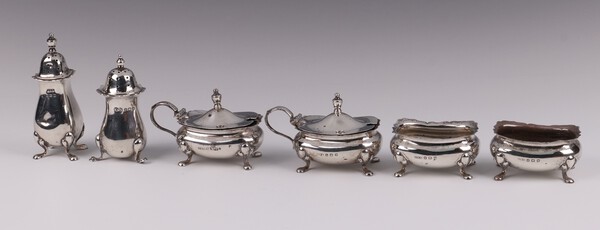 Lot 199 A 4 piece silver condiment set comprising pair of salts and pair of mustards, Birmingham 1920 by E S Barnsley & Co. the mustards with blue glass liners, together with 2 silver peppers, 191 grams £110-140