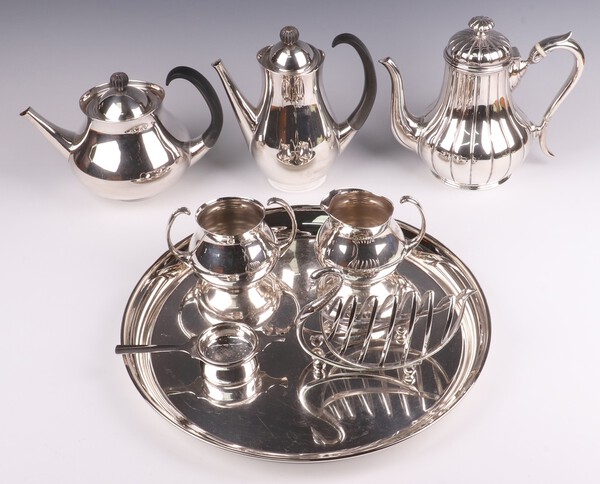 Eric Clements for Mappin & Webb, a 4 piece silver plated tea service comprising teapot, hot water jug, twin handled sugar bowl and milk jug, a Britannia metal coffee pot, circular silver plated tray, a toast rack in the form of a swan and a tea strainer