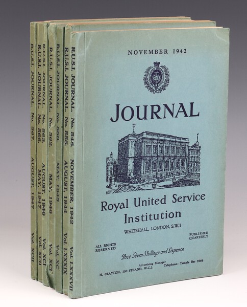 Seven volumes of 1940's Royal United Service Institution Journals, to include November '42, August '44, May '45, May '46, August '46, (written to front cover Tizard's address. initialled B.N.W), May '47, August '47