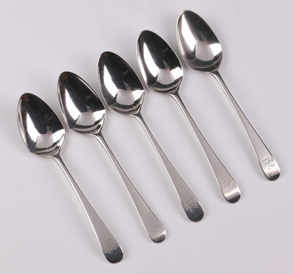 Lot 203 A set of 5 William IV silver Old English pattern teaspoons with armorial decoration, London 1834, by George Smith (III) and William Fearn, 65 grams £40-60