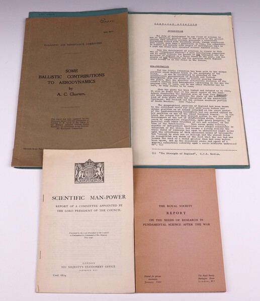 A collection of 7 post-war pamphlets and a document including:- Some Ballistic Contributions to Aerodynamics (initialled B.N.W. to paper cover) 1947, Scientific Man-Power 1946, Report on The Needs of Research in Fundamental Science After the War 1945, 61pp., signed B.N. Wallis to endpaper, The Quarterly Journal of Mechanics and Applied Mathematics Vol II Part 1 March 1949, initialled B.N.W. to paper cover, The Institution of Electrical Engineers initialled B.N.W. to paper cover, Smith Maxwell and O'Farrell M, Aviation fuel, 1954 initialled B.N.W. to paper cover, together with a typed document "Post-War Aviation" (undated with maps)