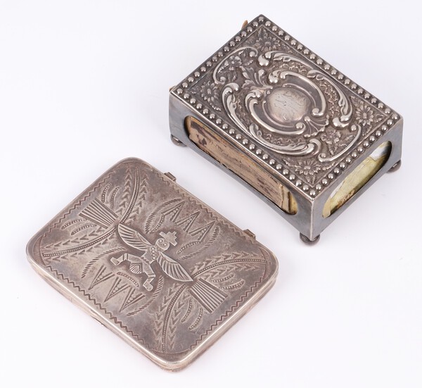 A Victorian rectangular embossed silver match box, raised on bun feet, Birmingham 1898, 39 grams, together with a rectangular box with hinged lid decorated a mythical beast 7cm x 5.5cm  £40-60