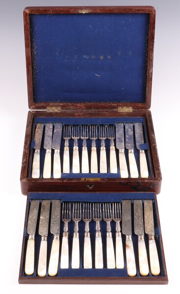 Lot 209 A cased set of 12 Victorian silver plated fruit knives and forks with mother of pearl handles, in a walnut box £30-40