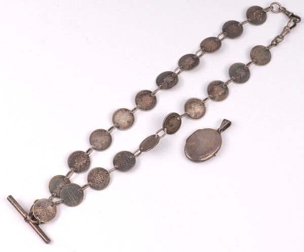 Lot 209 An Albert chain formed from Victorian 2 annas coins, together with a silver locket pendant and a silver napkin ring £60-70