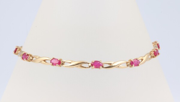 A 14ct yellow gold bracelet set 10 oval cut rubies, 19cm, 4.8 grams