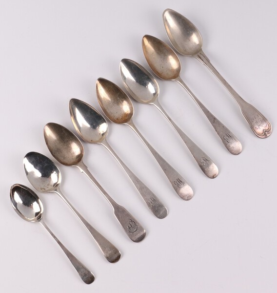 Lot 210 Four Georgian Scottish silver Old English pattern teaspoons, Edinburgh 1806, monogrammed and 4 other silver teaspoons, 110 grams £50-70
