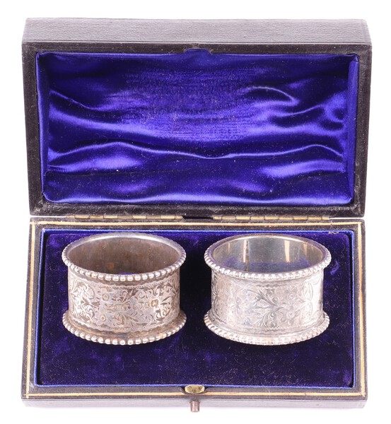 Lot 211 A cased pair of Victorian engraved silver napkin rings Birmingham 1897 by Hillard and Thomson, 57 grams £40-60