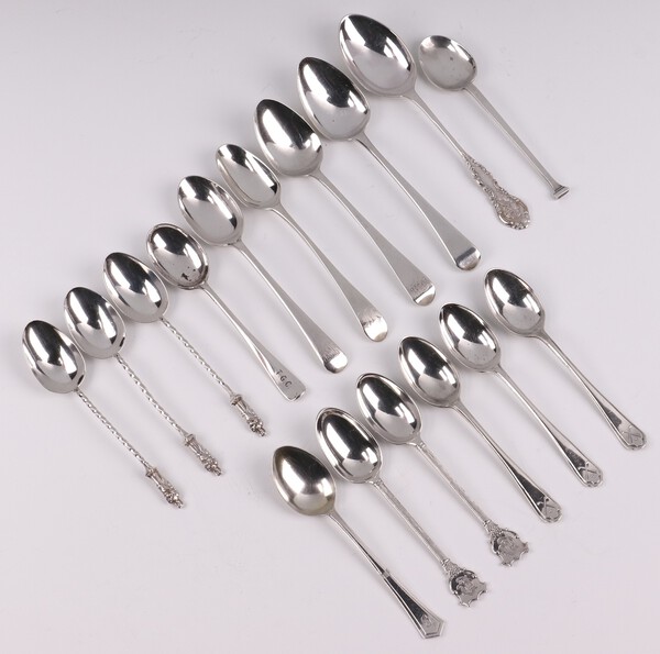 Lot 212 Three Victorian silver apostle teaspoons Sheffield 1884, 3 Georgian silver Old English pattern teaspoons and 10 tea spoons, 216 grams £120-150