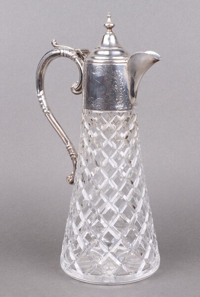 Lot 213 A Victorian style waisted cut glass claret ewer with engraved silver mount, Birmingham 1972, makers marks rubbed £150-200