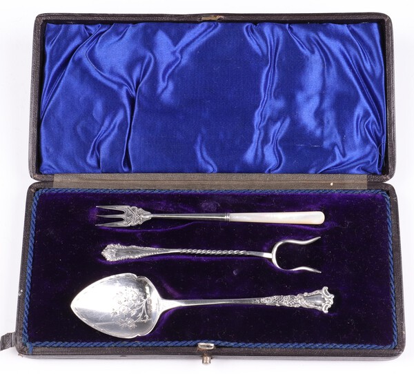 Lot 214 A 2 piece cased preserve set comprising jam spoon and fork (lacking butter knife), Birmingham 1912 with an associated 3 pronged fork with mother of pearl handle, Birmingham 1901, 3.3g gross £5-10