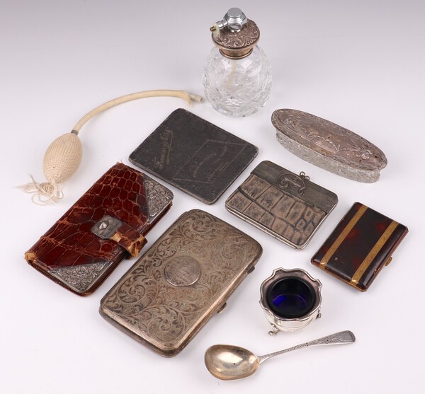 A silver salt with blue glass liner, a silver jam spoon, an engraved silver plated cigar case, crocodile and silver mounted purse, a cut glass perfume atomiser with silver collar and a oval cut dress dressing table jar with embossed silver lid (some holes to lid)