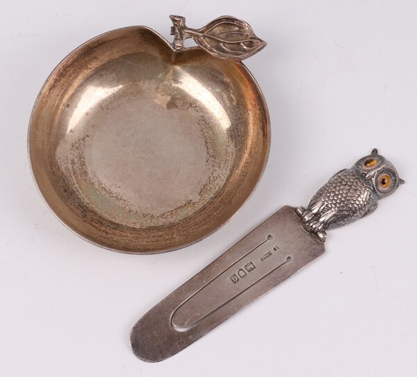 Lot 217 A Victorian silver bookmark decorated an owl with hardstone eyes London 1898 by Sampson Mordan, a Continental circular silver dish in the form of an apple £50-70