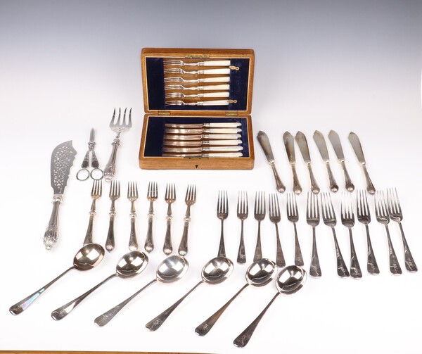 A pair of silver plated grape scissors, 6 silver plated fish knives and forks by Walker & Hall, a pair of ditto fish servers, 6 Old English pattern rat tail soup spoons, 6 ditto dinner forks, 5 ditto pudding forks (all monogrammed) and 6 plated fruit knives and forks with silver collars and mother of pearl handles contained in an oak box