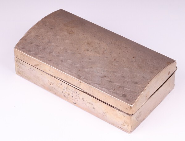 Lot 221 An engine turned silver cigarette box with domed hinged lid, monogrammed, marks rubbed, 6cm h x 16cm w x 9cm d £80-120