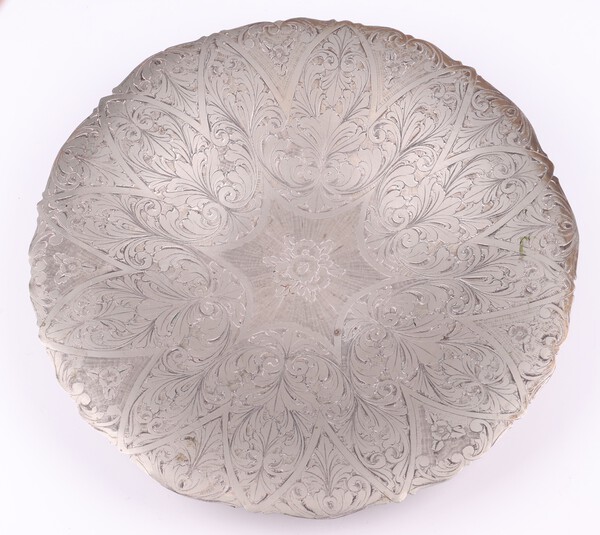 Lot 223 A circular Eastern engraved white metal floral bowl, raised on 3 panelled doors, the reverse marked A1000, 30cm diam. £40-60