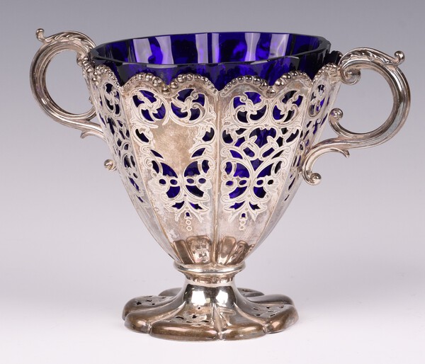 Lot 231 A Victorian pierced silver twin handled bowl with blue glass liner, Sheffield 1850 by Henry Wilkinson & Co. 209 grams £120-150