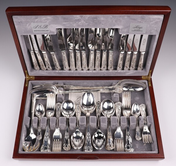 A 62 piece canteen of S & B Kings Pattern silver plated flatware comprising large serving spoon and fork, 4 serving spoons, 8 soup spoons, 8 dinner knives, 8 dinner forks, 8 pudding forks and 8 pudding knives, 8 pudding spoons, 8 teaspoons, together with 6 Italian silver plated pastry forks and a pair of Italian silver plated salad servers, all contained in a mahogany finished canteen box