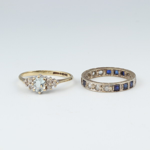 Lot 24 A 9ct white gold half eternity ring set square cut sapphires (1 missing) and white stones, size G, together with a 9ct gold dress ring set a blue stone with 6 white stones to the centre, 3.2 grams gross £80-120