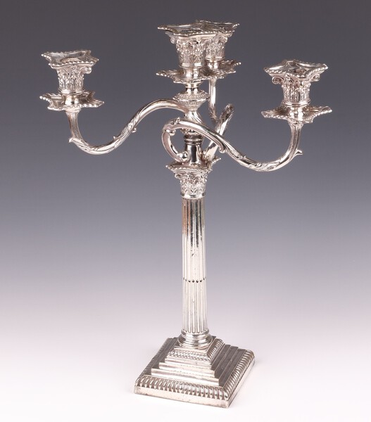 Lot 241 Carrington, a 19th Century silver plated 5 light candelabrum on a reeded column with Corinthian capital and stepped base 47cm h, the base marked Carrington 350 Regent Street £100-140