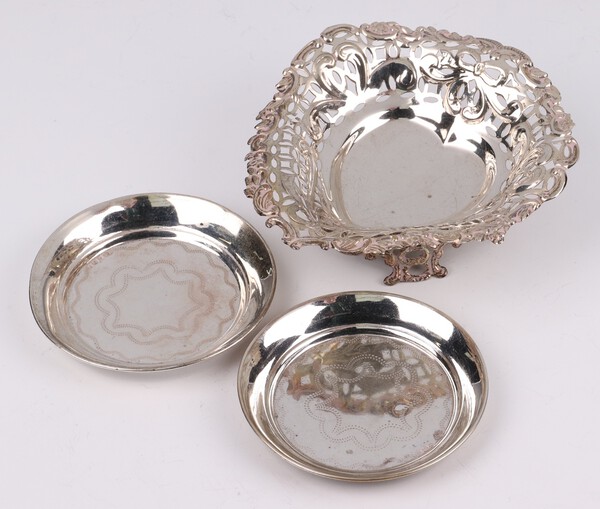 Lot 241 A Victorian pierced silver heart shaped dish London 1894, marks rubbed, together with 2 circular engraved silver dishes London 1923 106 grams £50-75