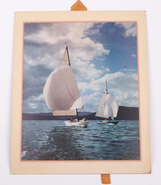 An undated Christmas card, the front with coloured print after Ian Gilchrist of The Yacht Medici print "Spinnakers Full", the reverse marked "With all good wishes to you and Mrs Wallis for a Very Happy Xmas and New Year, from all at R & D" and hand signed by them 22cm x 17cm