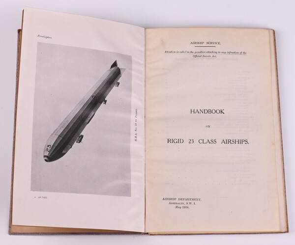 Handbook on Rigid 23 Class Airships 1918, Airship Department May 1918, 8vo, 86pp bound in blue cloth with debossed white text. Fading to spine and cover, minor rubbing to corners and edges of spine. Photos, diagrams and fold out coloured plates throughout. Signed B.N.Wallis to endpaper and stamped 26. Pastedown with glued confidential Government statement