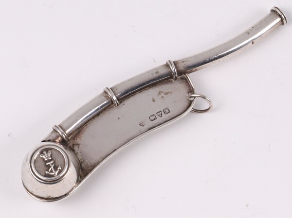 Lot 250 A silver bosun's call Chester 1912, possibly by Haseler Brothers (Edward John Haseler and Noble Haseler) marks rubbed £50-75