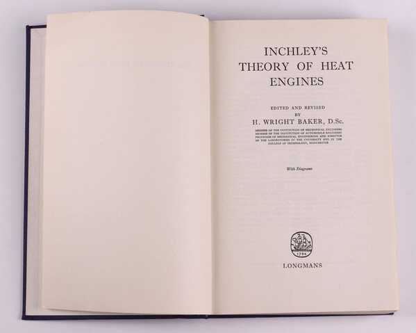Lot 255 WRIGHT BAKER, H. Inchley's Theory of Heat Engines, London: Longman, 8vo, 455pp. New Impression 1963, bound in contemporary purple cloth, silver lettering, signed in pencil B.N. Wallis to endpaper £80-120