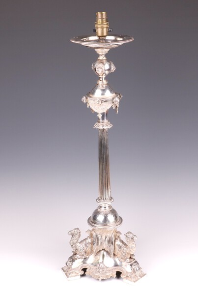 Lot 260 An impressive Victorian silver plated table lamp with turned and reeded column supported by 3 figures of seated camels 58cm high £80-120