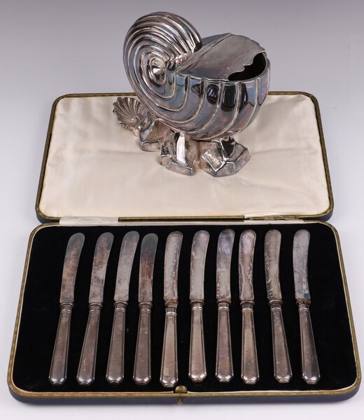 Lot 261 A Britannia metal shell shaped spoon warmer 13cm and a set of 10 silver handled tea knives, cased £40-60