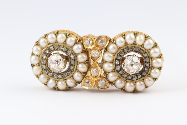 Lot 27 A 19th Century, yellow gold, testing as 22ct, bar brooch formed of 2 roundels, each set an old rose cut diamonds surrounded by pearls and with 6 smaller diamonds to the centre £300-500