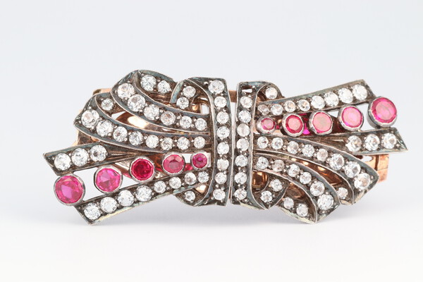 Lot 28 A 1920's metamorphic paste set brooch/clip in a gold, testing as 14ct mount, 3.13 grams gross £100-150