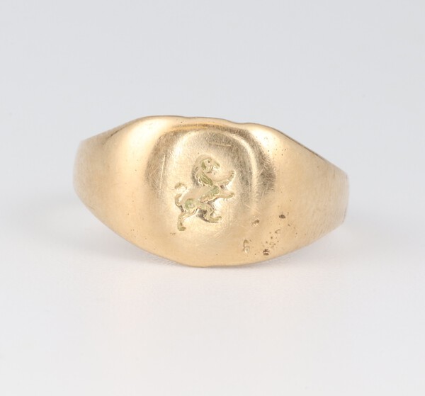 A gold testing as 18ct (marks rubbed) signet ring (misshapen), size H, 3.4 grams