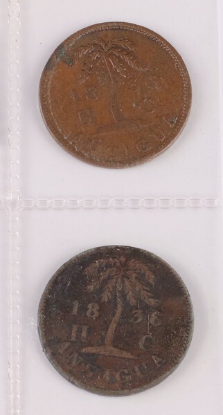 Lot 301 Two copper farthing coins issued by the British Administration of Antigua and Barbuda, 1836. Grade VF. KM Tn1. £30-50