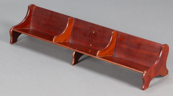 Lot 302 A 1930's mahogany 3 section table top book trough, raised on panelled supports 16cm h x 82cm w x 20cm d £150-200