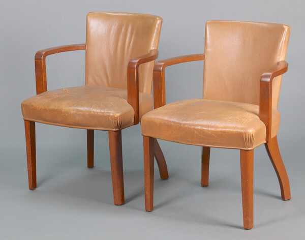 Lot 303 A pair of 1930's oak open arm chairs, the seats and backs upholstered in brown leather, raised on square supports 84cm h x 61cm w x 63cm d (seat height 48cm) £200-300